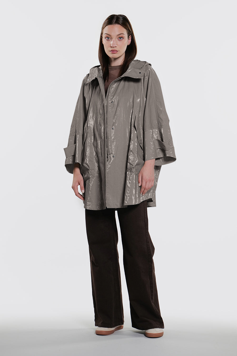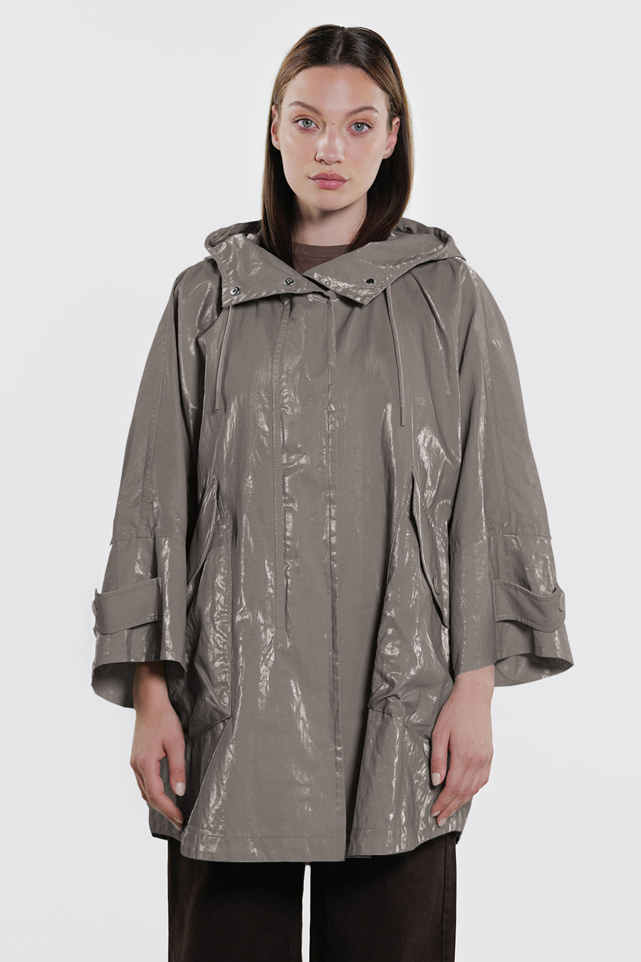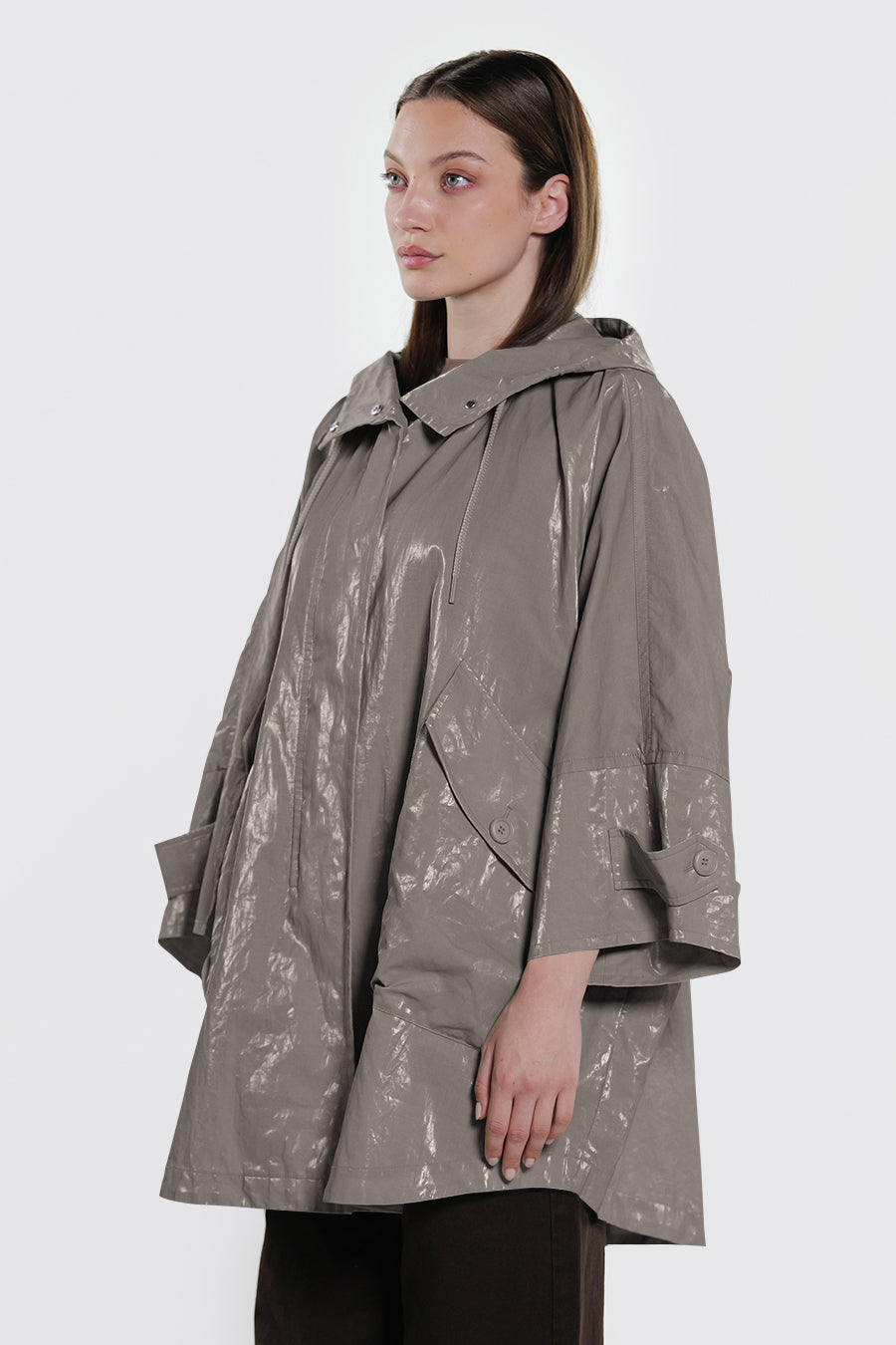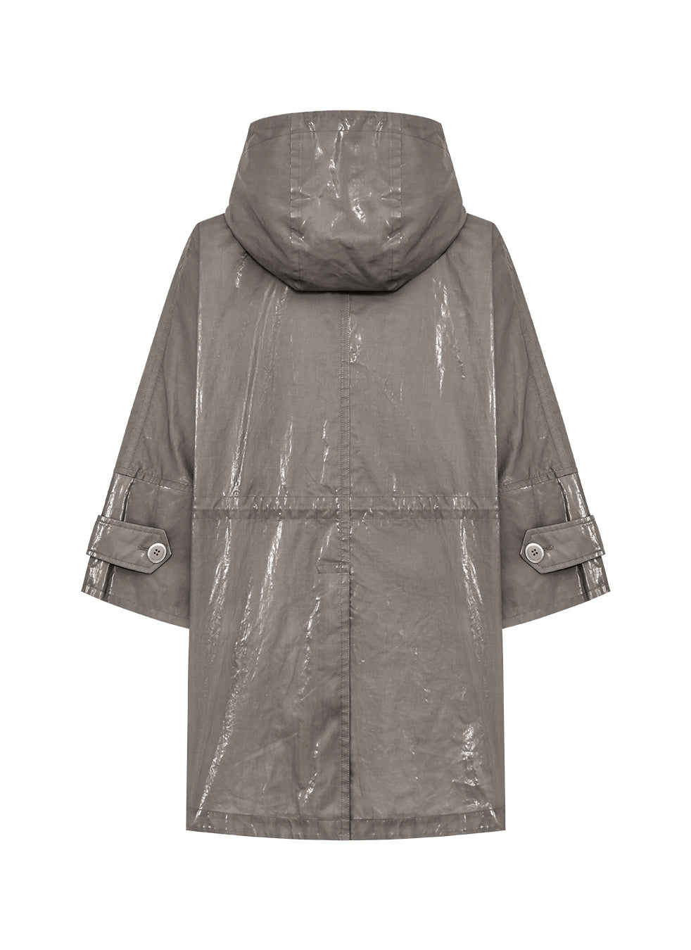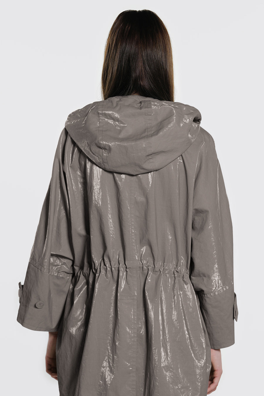 Lightweight white ramie canvas with semi-transparent colored polyurethane surface coating that reveals the structure of the fabric below, two-tone fabric: shiny on the outside with an iridescent effect. The rubberized effect due to polyurethane makes the fabric water-repellent.