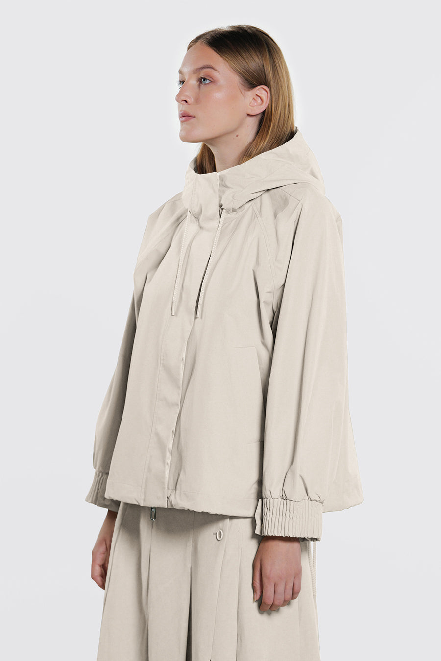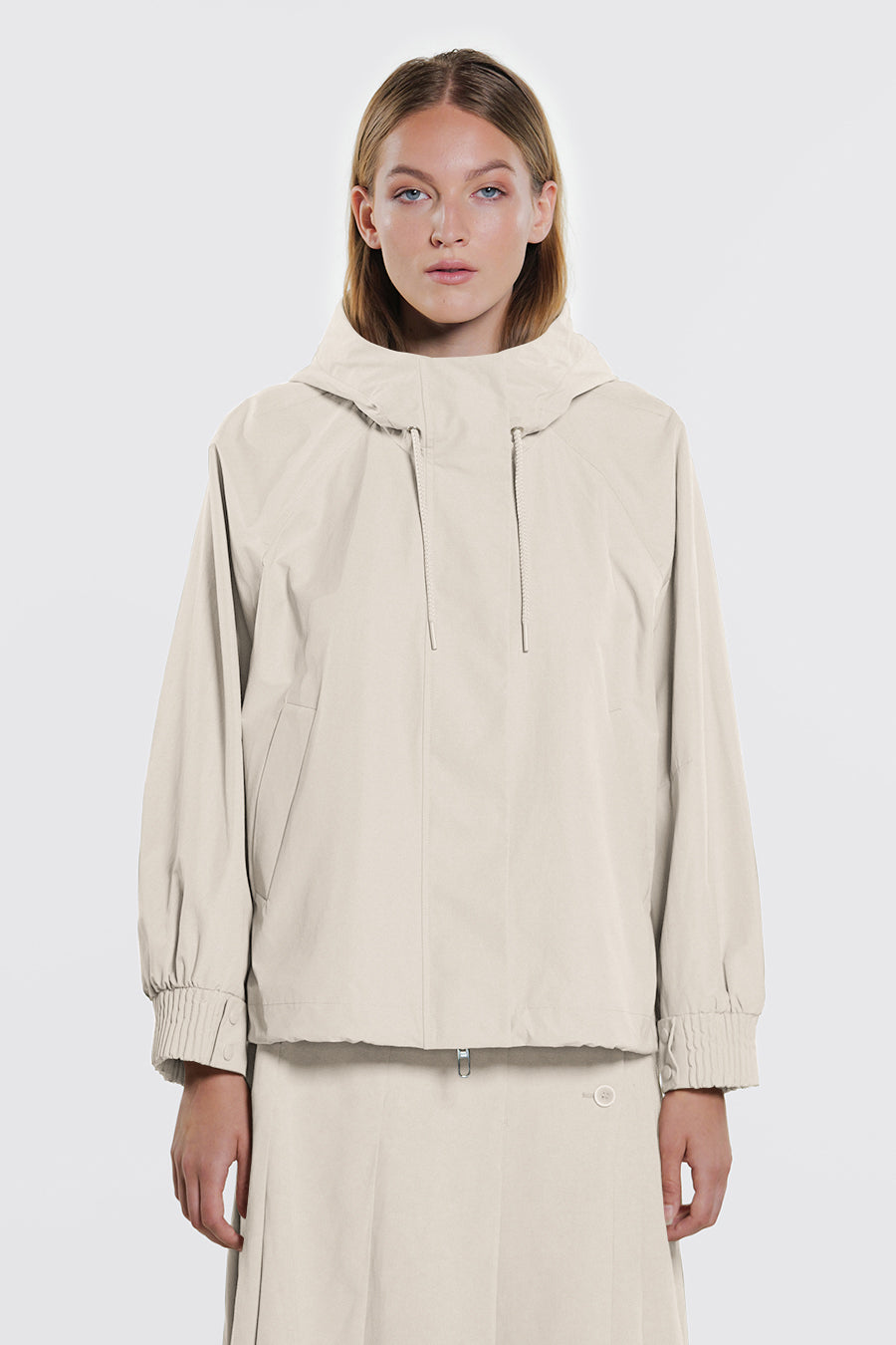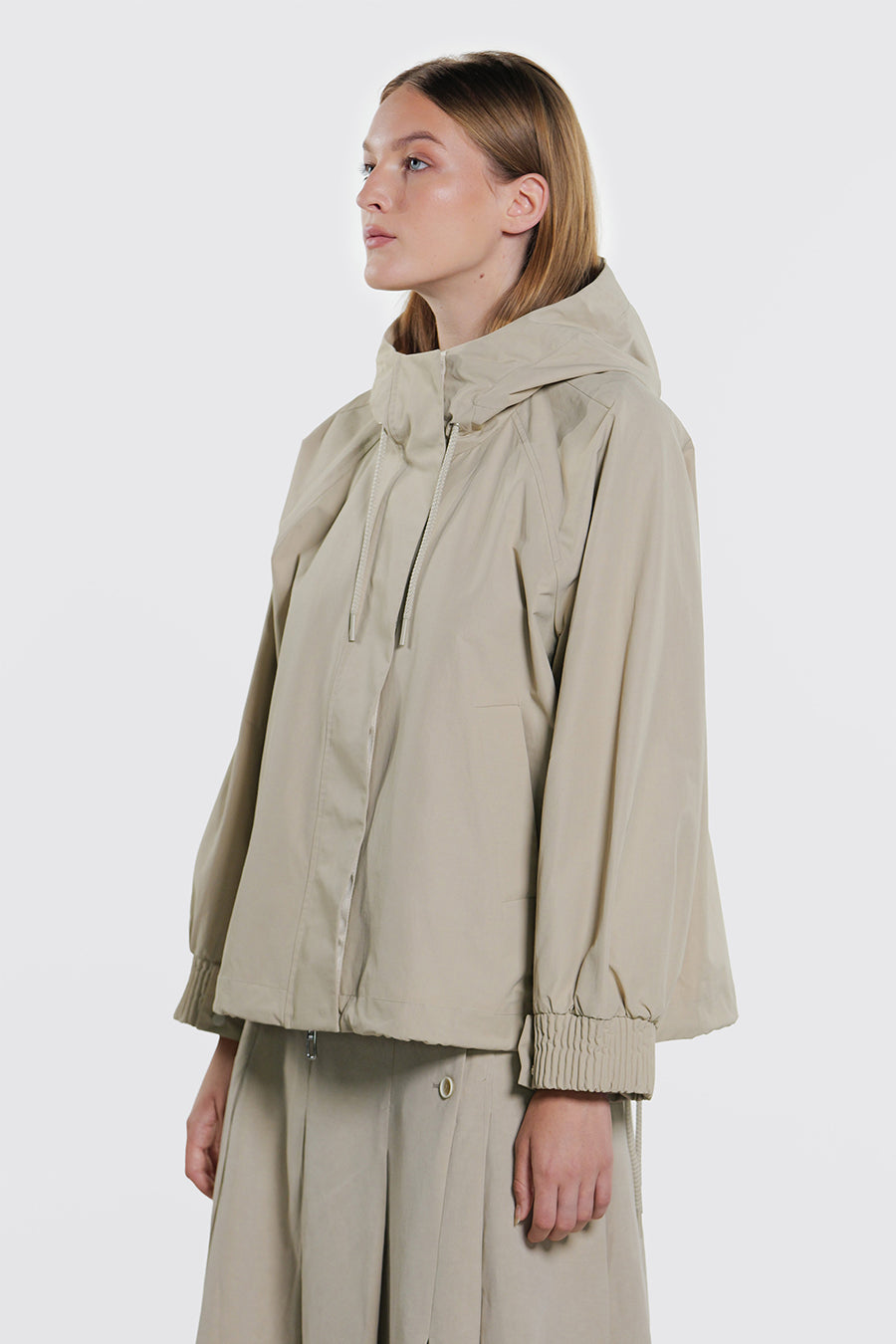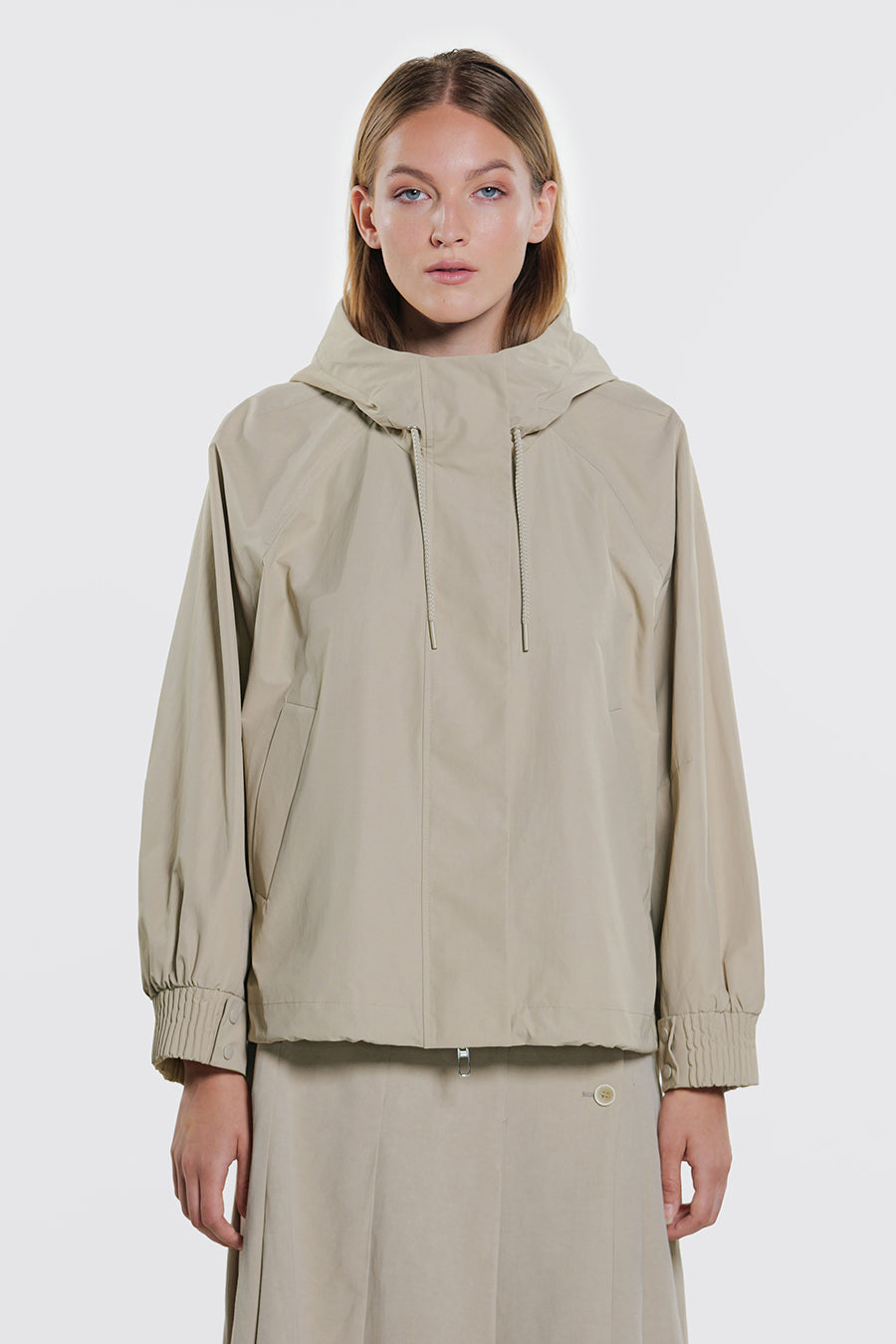 • Raglan sleeves with balloon line at the bottom, gathered by a high cuff with hidden sewn elastic band, adjustable with snap buttons
