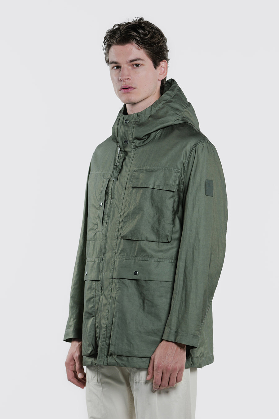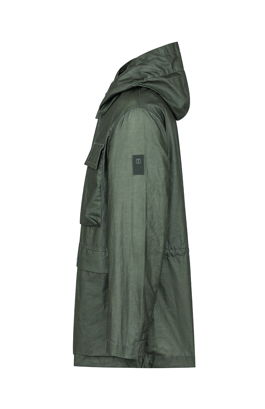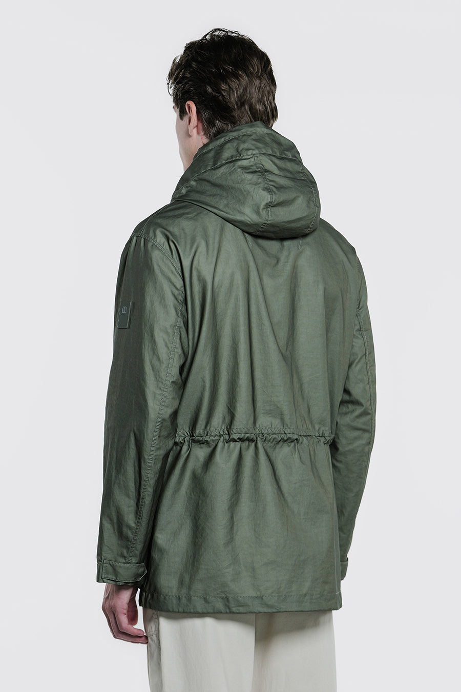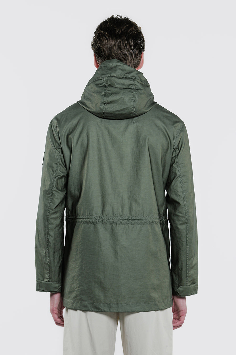 • Short parka in ramie fabric with surface coating (rubberized texture)