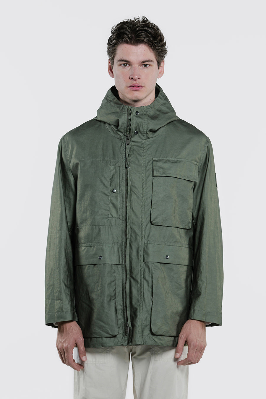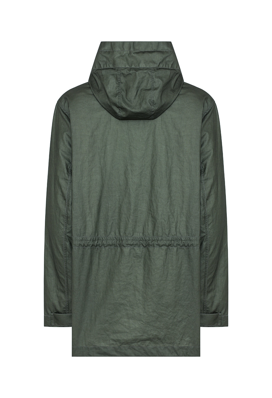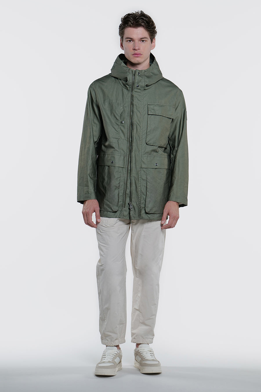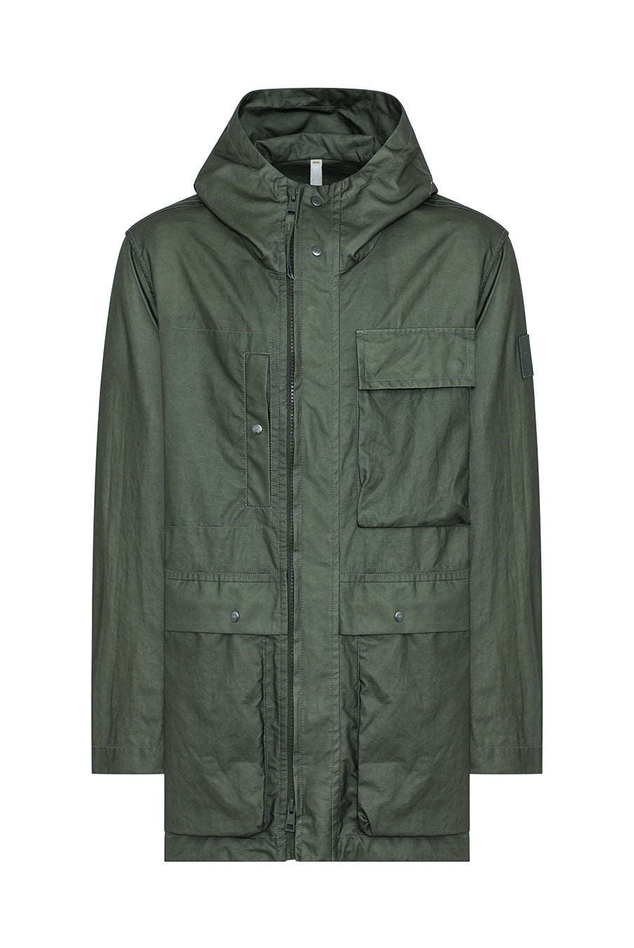 • Short parka in ramie fabric with surface coating (rubberized texture)